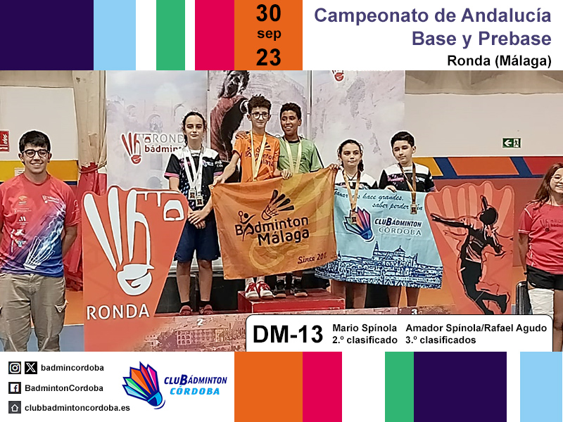 En dobles masculino llegaron dos podios. En liguilla de grupo, Mario Spínola junto a su compañero Sergio Henríquez (Benalmádena) vencieron en dos partidos, ante Amador Spínola y Rafael Agudo (18-21, 21-6, 21-18) y frente a Daniel García y Rui Montilla (Benalmádena) por 21-16 y 21-9. En el partido por el oro cayeron ante Emilio Fernández y Sebastián Gómez (Málaga Evolution y Alhaurín de la Torre) por 21-15 y 21-19. El bronce fue para Amador Spínola y Rafael Agudo, tras su victoria ante Daniel García y Rui Montilla (Benalmádena) por 21-14 y 21-18.