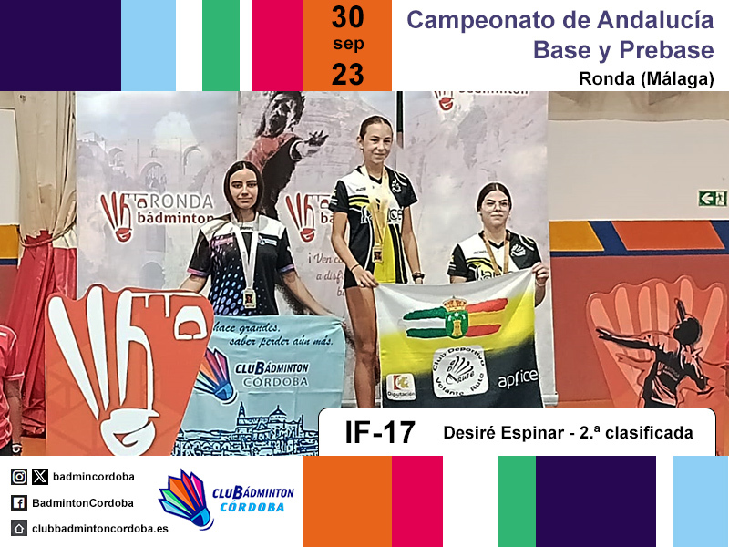 En la modalidad de individual femenino, Desiré Espinar logró la plata. En la fase de grupos ganó sus dos partidos, ambos en tres sets. El primero ante Mónica Cortés (Sierra Morena) por 8-21, 21-7 y 21-12. El segundo frente a Ángela Moyano (Volante Rute) por 21-16, 20-22 y 21-19. Esto le dio el pase directo a la final, al estar en el grupo A. Allí se topó con Sara Arenas (Volante Rute), con quien cayó por 21-7 y 21-10.