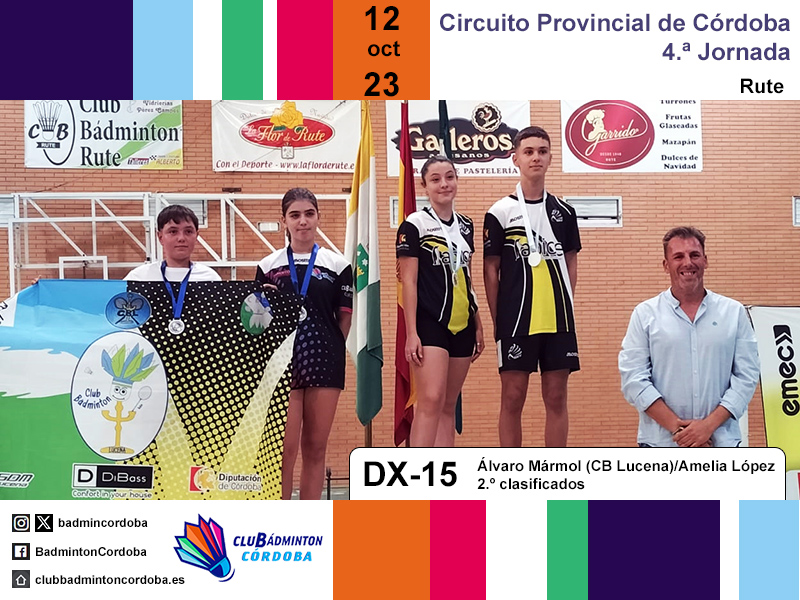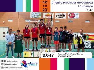 El pasado jueves 12 de octubre, aprovechando la fiesta nacional, se celebró en el pabellón de deportes Gregorio Piedra de Rute la cuarta jornada del Circuito Provincial de bádminton 2023, sub-13, 15 y 17 organizada por el CD Volante Rute. Hasta el municipio de la Subbética cordobesa se desplazaron seis deportistas acompañados de la entrenadora Inmaculada Rojas, el monitor Rafa Rodríguez y con Miguel Muñoz de match control en una competición con 116 deportistas inscritos.