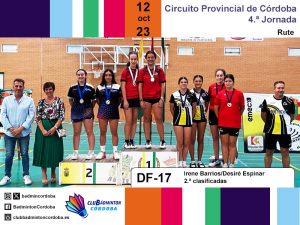 En dobles femenino sub-17, Irene Barrios y Desiré Espinar añadieron otra medalla a su extenso palmarés. En el grupo A vencieron los dos partidos, ante Paula Pizarro-Alba Romero (La Encina) y en el ya clásico ante Ángela Moyano-Cristina Ramírez (Volante Rute) en tres duros sets que acabaron con un 28-26. En la final cayeron ante Jara Barrientos-Ana Justos (La Encina) en dos sets logrando la plata.