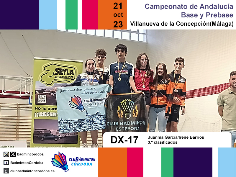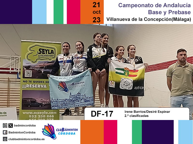Irene Barrios y Desiré Espinar volvieron al podio una semana después del provincial de Rute. Subieron al segundo puesto en dobles femenino sub-17 después de vencer a María Hinojosa-Margarita Jiménez (Volante Rute) por 21-13 y 21-14 y perder ante Ángela Moyano-Cristina Ramírez (Volante Rute) en tres sets por 14-21, 21-18 y 21-14.