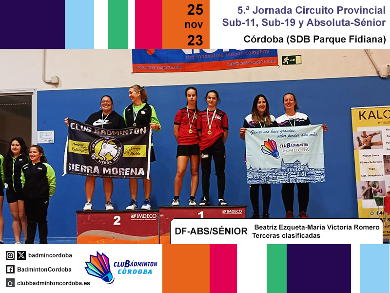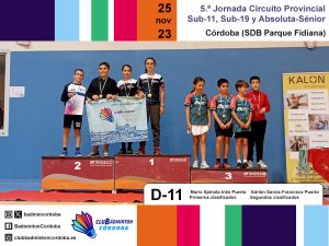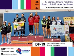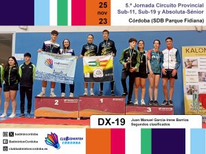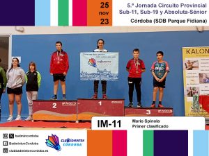 Este sábado 25 de noviembre se ha disputado en Córdoba capital la quinta jornada del Circuito Provincial de 2023. La Sala de Barrio Parque Fidiana fue testigo de la última cita cordobesa, con la presencia de 27 deportistas del club en las tres categorías a disputar (siete en sub-11, tres en sub-19 y 17 participantes en absoluta-sénior), logrando podios también en todas ellas. Junto a la entrenadora Inmaculada Rojas estuvieron en pista asistiendo también varios de los presentes en los cuadros de juego. Ocho de los 17 inscritos en absoluta sénior eran padres y/o madres de los participantes sub-11 y sub-19, por lo que el ambiente fue muy familiar. Seña de una de las identidades de nuestro club.