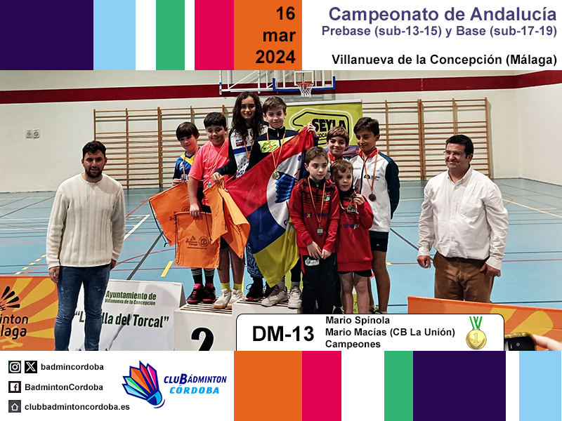 En dobles masculino sub-13, Mario Spínola tuvo de pareja a Mario Macías (CB La Unión). En cuartos de final derrotaron a Daniel García y Rui Montilla (CB Benalmádena) por 21-16 y 21-13. En semifinales vencieron a Javier Gracia y Eduardo Muñoz (CB La Encina) por 21-9 y 21-4. Ya en la final, consiguieron vencer también en dos sets a Jairo Cano y Jorge Díaz (CB Estepona – CB Vélez Málaga) por 21-12 y 21-14. Se proclamaron de esta manera campeones de Andalucía Prebase.