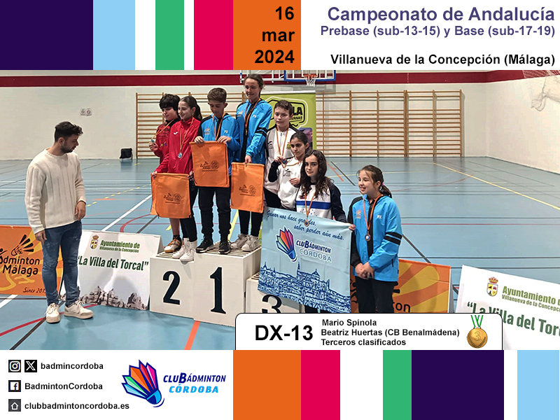 Mario Spínola también subió al podio en dobles mixtos sub-13. Con Beatriz Huertas (CB Benalmádena) de pareja, vencieron a Matías Carneros y Ainhoa Montiel (CDB Málaga Evolution) por 21-16 y 21-10 en cuartos de final. En semifinales cayeron ante Gabriel Barrientos y Clara Casado (CB La Encina – CB Montilla) por 21-9 y 21-15, consiguiendo el bronce.