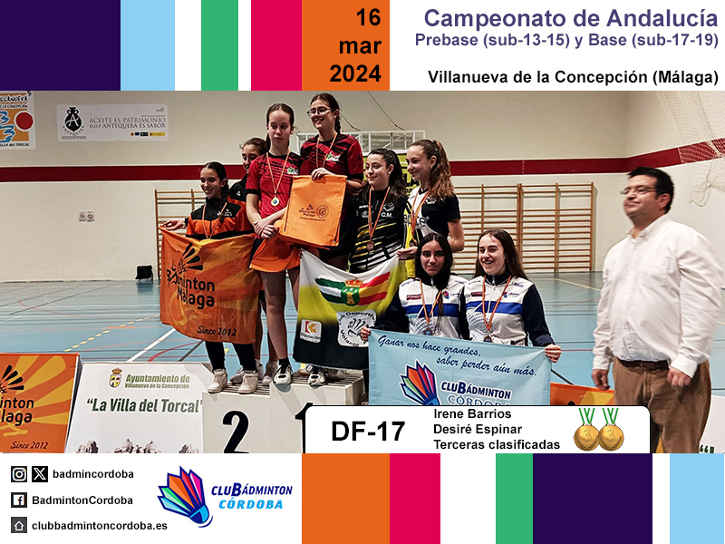 Irene Barrios y Desiré Espinar no fallaron a su cita con el podio. Lograron ganar en un intenso partido de cuartos de final a María Hinojosa y Margarita Jiménez (CD Volante Rute) a tres sets por 21-19, 15-21 y 21-19, pero perdieron en semifinales ante Jara Barrientos y Paula Pizarro (CB La Encina), por 21-12 y 21-14.