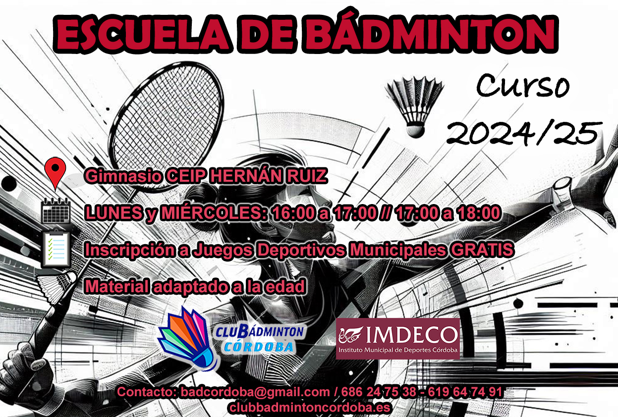 Esta escuela está enfocada al aprendizaje del bádminton, sin olvidar la importancia de pasar un buen rato, haciendo deporte, de una manera compartida y sana, desde el respeto y el compañerismo en un ambiente agradable. Su responsable será nuestro entrenador y jugador, Miguel Muñoz.