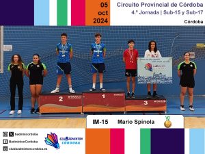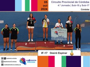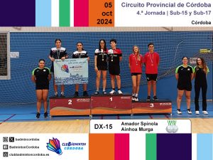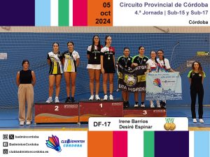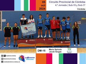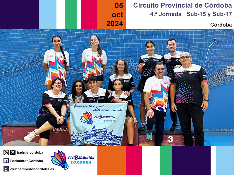 El sábado 5 de octubre se disputó, en la Sala de Barrio Parque Fidiana de Córdoba capital, la cuarta jornada del Circuito Provincial de bádminton. Las categorías sub-15 y sub-17 saltaron a las pistas representadas por ocho deportistas, acompañados por los técnicos Inmaculada Rojas y Miguel Muñoz, y los monitores Cristóbal Espinar, Juanma García, Javier Romera, Pilar Serrano y Amador Spínola.