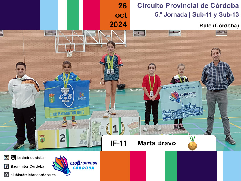 En individual femenino sub-11, Marta Bravo consiguió el bronce tras pasar como segunda de grupo y vencer en cuartos de final a María García (CB La Encina). En semifinales cayó ante Ángela Sánchez (CB Rute). También participó Candela Spínola, en un duro grupo de fase previa de grupos donde se enfrentó a la ganadora final y a una semifinalista.