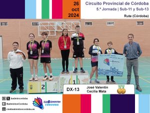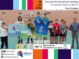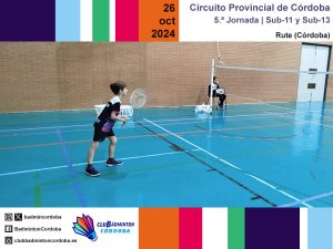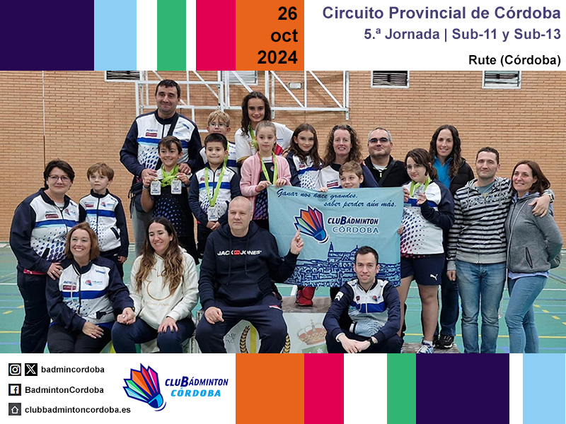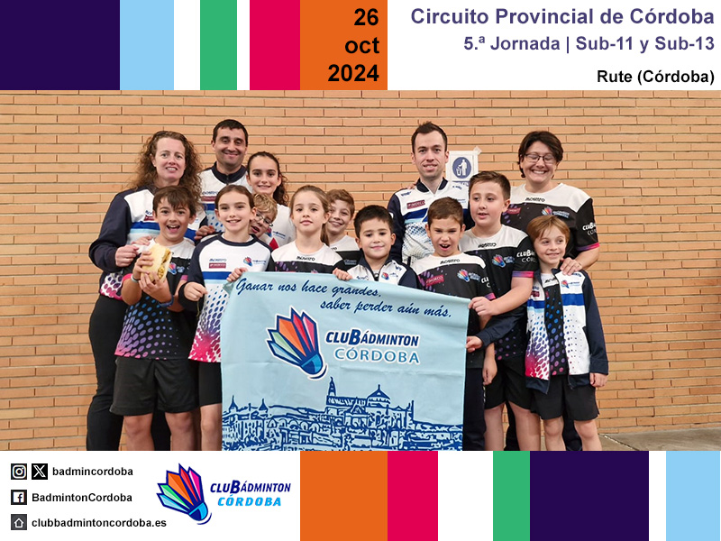 El sábado 26 de octubre tuvo lugar la quinta jornada del Circuito Provincial de Córdoba, dirigida a las categorías sub-11 y sub-13. El pabellón Gregorio Piedra de Rute fue testigo de una intensa jornada a la que acudieron 12 niños y niñas del club, con los entrenadores Inmaculada Rojas y Miguel Muñoz, más el apoyo de los monitores Pilar Serrano, Amador Spínola y José Valentín.