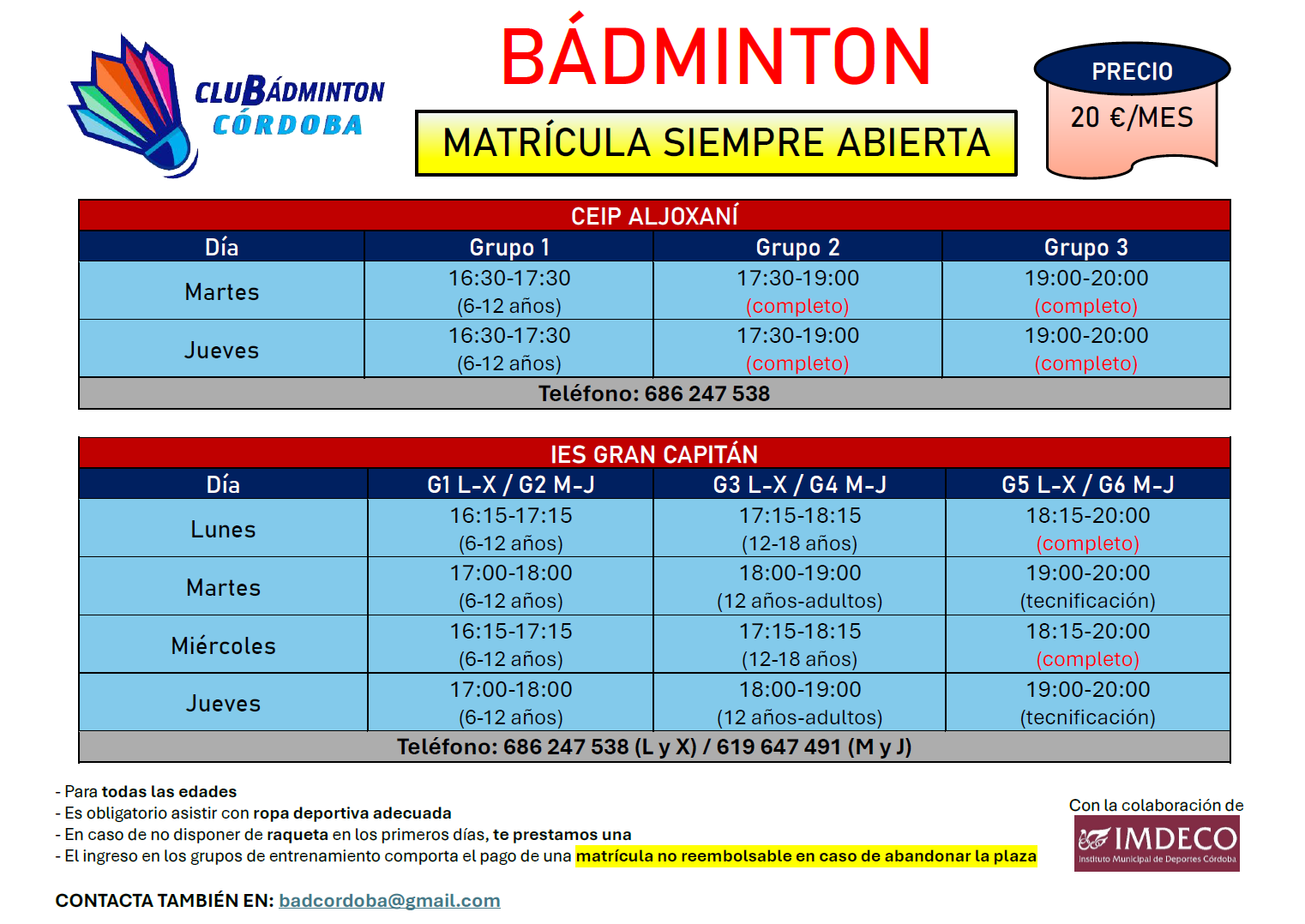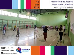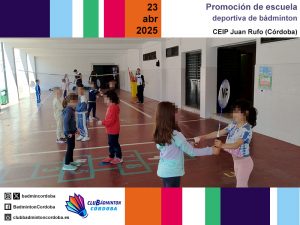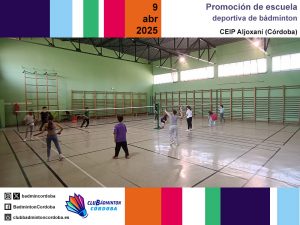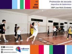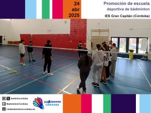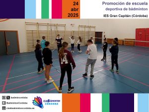 Los días 9, 10, 11, 23 y 24 de abril, los técnicos del club Inmaculada Rojas, Miguel Muñoz y Javier Romera realizaron varias promociones de escuelas deportivas de bádminton. Los centros educativos CEIP Aljoxaní, CEIP Juan Rufo e IES Gran Capitán fueron testigos de varias mañanas intensas de bádminton. El alumnado de Primaria y de 1.º de ESO asistió a exhibiciones de golpeos y también cogió la raqueta para llevar a cabo diferentes juegos.