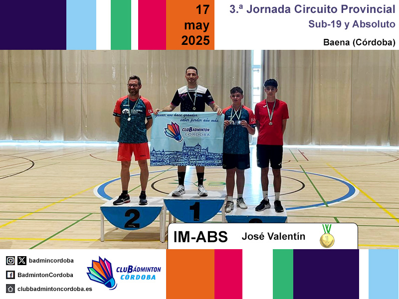 José Valentín se llevó el primer puesto después de vencer a Sergio López (CB Montilla) en octavos de final, a Javier Rodríguez (CB Montilla) en cuartos de final, a Pablo Rey (CB Montilla) en semifinales, y en la final a Fernando Molina De Tomás (CB Baena), sin ceder un set en toda la competición. Javier Romera y Juan Luz no pudieron pasar de octavos de final.