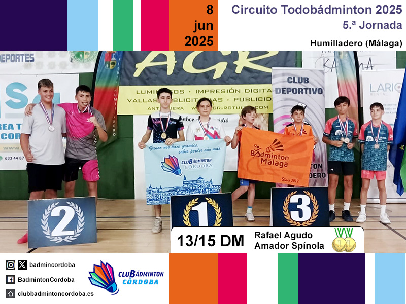 Impoluta participación de Rafael Agudo y Amador Spínola en 13/15 DM. Vencieron en cuartos de final a Adrián Burgueño-Fabio Pérez (CD Volante Rute-CB Rute) por 21-9 y 21-15, en semifinales a Mario Castillo-Juanjo Lastres (CB Baena) por 21-12 y 21-7, y en la final a los locales José Antonio Gómez-Álvaro Villarrazo (CDB Humilladero) por 21-16 y 21-12. En individuales no tuvieron la misma suerte. Amador Spínola venció en octavos de final a Martín Moreno (CB Ronda) por 21-9 y 21-15, pero cayó en cuartos ante Jairo Cano (CB Estepona) por 21-12 y 21-11. Rafael Agudo perdió en cuartos de final ante Juanjo Lastres (CB Baena) por 21-11 y 21-15, mientras que ganó a Darío Velasco (CB Puente Genil) por 21-17 y 21-16 en el partido de consolación.