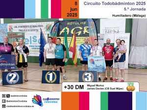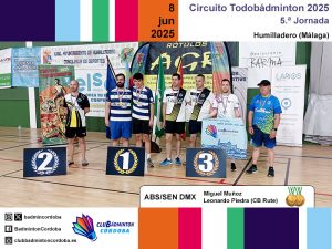 En dobles masculino sénior +30, Miguel Muñoz participó con James Davies (CB Suel Mijas). En cuartos de final vencieron a Francisco Manuel Navajas-Pedro Lopera (CD Volante Rute) por 21-18 y 21-13. Se quedaron a un paso de la final, al caer en semifinales, en tres intensos sets frente a Antonio Fuentes-Jorge Moreno (CB Palma-CB Jorge Guillén) por 21-23, 21-13 y 21-19. En dobles mixtos sénior +45, Rafael Rodríguez compitió junto a Wendy Weir (CB Suel Mijas). Ganaron en cuartos de final a José Luis Morales-Lyu Na (CB Ronda) por 21-9 y 21-10. En semifinales, se les escapó el partido en tres sets ante Valentín De Quinta-Saray Celina Gómez (CB Vélez-Málaga) por 23-21, 18-21 y 23-21. En dobles masculino/absoluto sénior, Miguel Muñoz junto a Leonardo Piedra (CB Rute), cayeron ante Jorge Carvajal-Alejandro Salobral (CB IES La Orden) por un doble 21-7, y frente a Francisco Manuel Navajas-Pedro Lopera (CD Volante Rute) por 21-18 y 21-19.