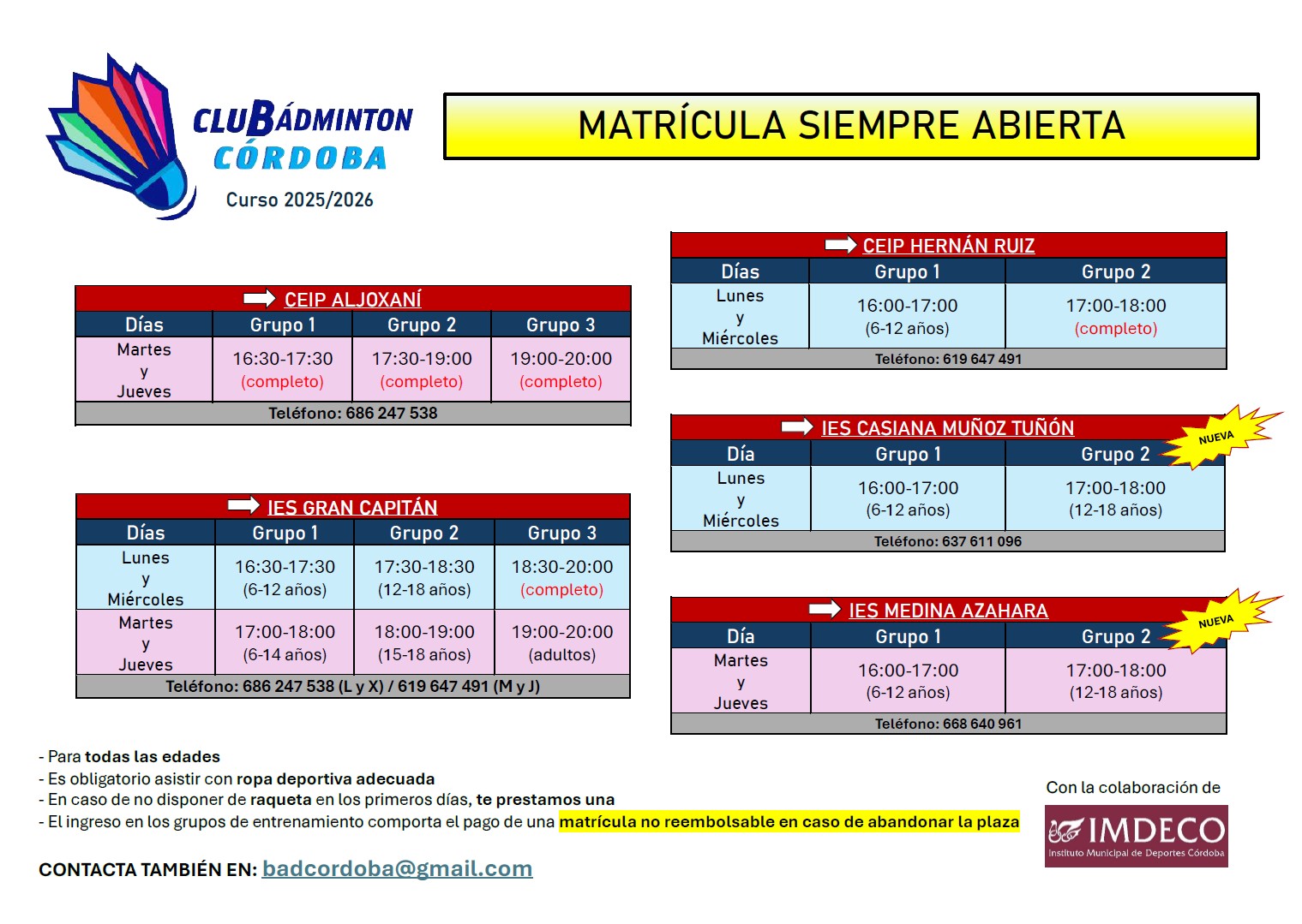La técnico nivel 1 del club, titulada por la Federación Española y la Mundial, Inmaculada Rojas, con una dilatada carrera en el bádminton como jugadora experimentada en las pruebas de dobles, es la persona responsable de las escuelas deportivas. Tenemos escuelas deportivas en el CEIP Aljoxaní y en el IES Gran Capitán, ambos ubicados en el barrio de Fátima. Desde septiembre de 2024, el técnico nivel 1 del club Miguel Muñoz es el encargado de entrenar en la escuela del CEIP Hernán Ruiz (barrio de Valdeolleros). Para el curso 2025/2026, el técnico nivel I, Javier Romera, será el entrenador de la escuela en el IES Casiana Muñoz Tuñón (barrio Huerta de Santa Isabel-Este), y la monitora Olimpia García de la escuela en el IES Medina Azahara (barrio Huerta de la Marquesa, Poniente Sur).