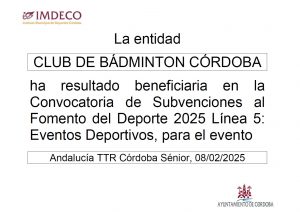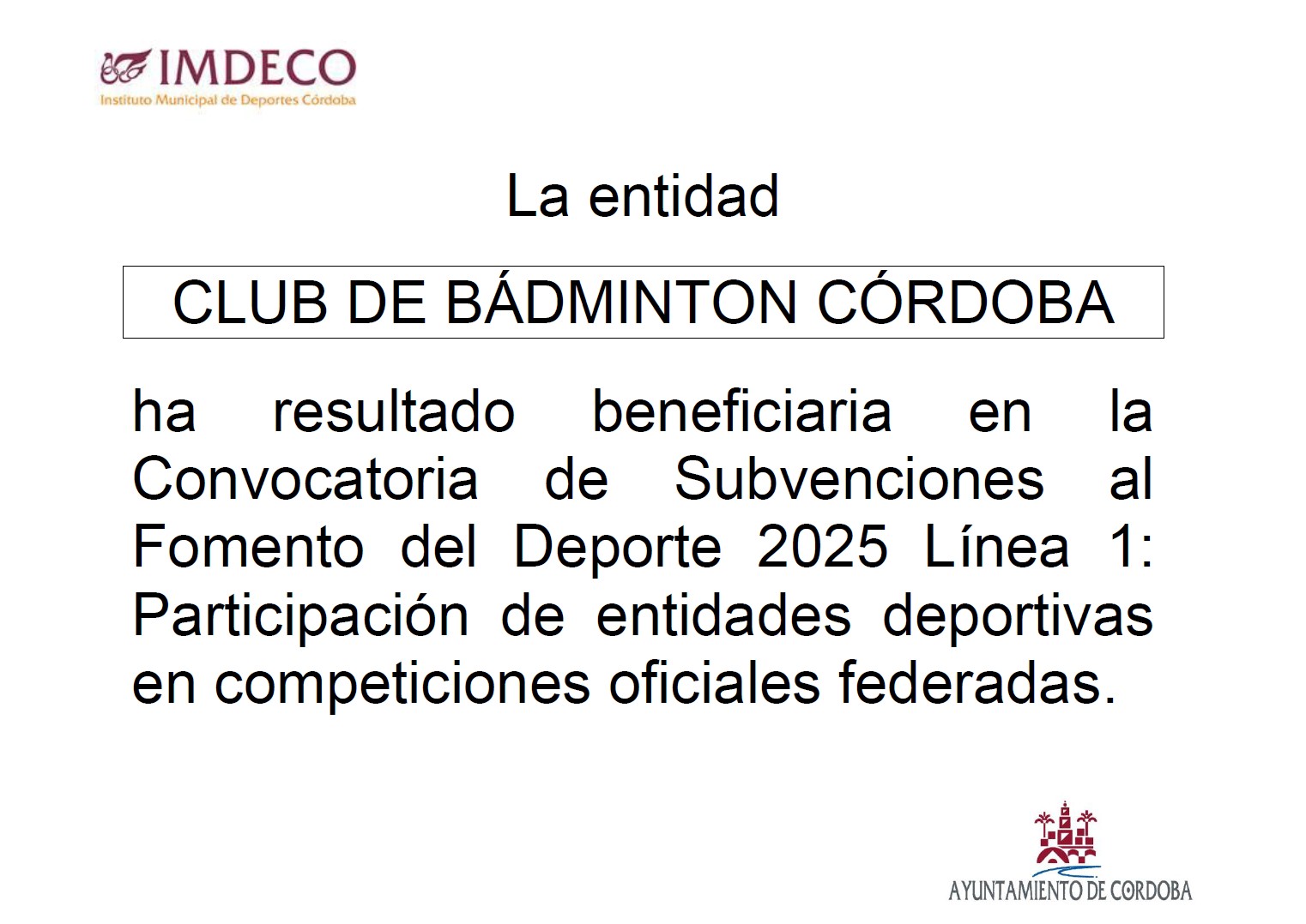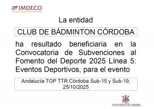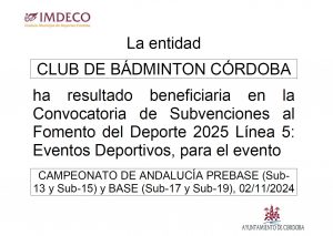 Cabe destacar que contamos con la colaboración del Instituto Municipal de Deportes de Córdoba (IMDECO) por medio de subvenciones para escuelas deportivas (línea 4), competición (línea 1) y eventos deportivos que organizamos (línea 5) en la convocatoria de 2025.